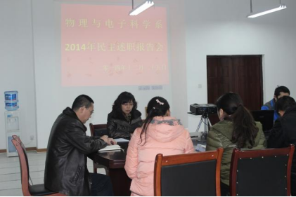 【本网讯】2014年12月25日,校纪委书记沈云与组织部一行到我系,参加2014年物理与电子科学系民主述职报告会。会议开始,系主任雷晓蔚教授就2014年我系情况做了总结,她指出2014年我系工作任务艰巨,但取得了不错的成绩。在实验室建设方面,共完成了近300万元的实验设备招标、安装;升本工作方面,在今年5月份才得知我系为升本系部的情况下,保质保量的完成了电子信息工程专业的升本准备工作;科研工作方面,2014年成功申报了一项省级科研项目,应用物理研究所聘请了2位校外教授为我系指导工作。雷主任强调这些成绩的取得,离不开物电系这群给力的同事。