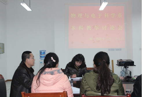 【本网讯】2014年12月25日,物理与电子科学系在系会议室召开了第三次本科教学讨论会,本次会议邀请了校纪委书记沈云参加。会议中雷晓蔚主任、梁潘副书记做了讨论发言,沈云书记做了总结。