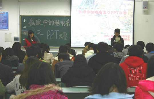 【本网讯】为了庆祝建系十周年,2014年11月14日举行了物电系建系十周年系列活动之“我眼中的物电系”PPT大赛,此次活动由我系主办,两委会承办。