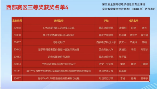【本网讯】2023年10月21日,第三届全国高校电子信息类专业课程实验教学案例设计竞赛(RIGOL杯)西部赛在重庆文理学院顺利举行,来自陕西、四川、云南、贵州、西藏、重庆、甘肃、青海、宁夏、新疆等地共109名教师参加此次比赛,我院电子信息工程专业教师李媛代表学校参赛。经过激烈角逐,李媛所设计的实验教学案例“基于MATLAB的语音信号的采集与处理”喜获西部赛区三等奖。