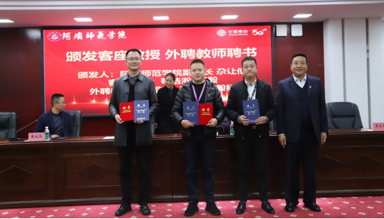 在仪式上,由阿坝师范学院副校长尕让他为移动公司高级工程师苟浩淞、王毅和李俊杨老师分别颁发客座教授、外聘教师证书,并合影。紧接着由武文道总经理作2024届移动定制班开班专题讲座。阿坝移动总经理武文道详细介绍了定制班的培养计划和课程设置。同时,四川移动将派遣专家定期授课,并为学生提供实习和就业机会,为他们的专业发展打下坚实的基础。随后由三位授课老师分别给同学讲解课程简介。