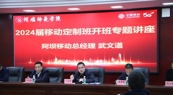 【本网讯】2023年12月15日下午2点30阿坝师范学院移动定制班开班仪式在行政楼2楼会议室隆重举行。这标志着学校与阿坝移动公司的合作进入了一个全新阶段,为学生提供了更广阔的学习空间和发展机会。本次开班仪式由教务处处长黄成兵主持,参会人员有阿坝师范学院副校长尕让他、阿坝移动总经理武文道、阿坝移动副总经理杨经强、阿坝移动人力资源部总经理龚文香以及相关学院及公司的其他领导、2024届移动定制班全体学员。