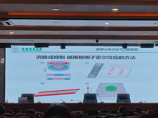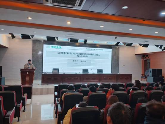 随后,学术交流活动进入磁性材料与拓扑自旋结构的学术讲座环节。此次讲座重点围绕磁性材料中拓扑弧子的应用与发展展开,介绍了以硬盘为代表的磁储技术已经趋于其功能极限,然后讲述了消除或抑制磁斯格明子霍尔效应的方法和DM的相互作用的相关理论,通过多个示意图展示了其原理和操作过程。最后,李老师为大家呈现了近年来在磁性材料研究领域的前沿成果,让同学们对该领域的最新动态有了更为全面的认识。