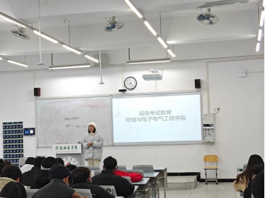 【本网讯】为端正考风考纪,加强学风建设,营造公平、公正、积极向上的考试氛围,培养学生的诚信意识与自我约束力。2024年12月24日,物理与电子电气工程学院于树人楼C301开展诚信考试教育主题班会。辅导员杨露老师主讲,物理与电子电气工程学院学生积极参加。