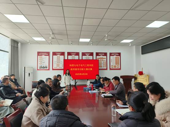 【本网讯】为深化教学改革,提升教师教学创新能力,物理与电子电气工程学院于2025年4月2日在实验楼C102举办教师教学创新大赛初赛。本次比赛聚焦课程思政、产教融合等方向,吸引了7名教师参赛,通过5-10分钟的教学创新设计汇报,角逐校级竞赛推荐资格。