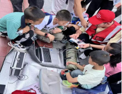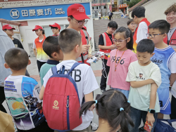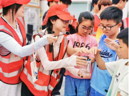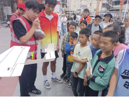 实操教学,提升技能。无人机环节点燃现场气氛。志愿者介绍其在震后侦察、洪涝物资投递等防灾场景中的应用,并进行飞行演示,还指导小朋友体验基础操控。