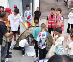 随后,团队示范应急避难所搭建、创伤加压包扎及心肺复苏术,小朋友积极参与模拟操作和抢答,现场氛围热烈。