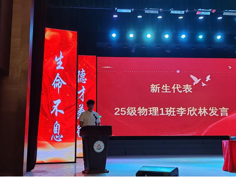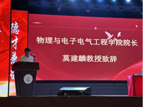 【本网讯】为助力2025级新生迅速适应大学学习生活、培育优良学风,9月7日上午,物理与电子电气工程学院2025级开学典礼在南苑剧场正式举行。学院党委书记卢永雪、院长莫建麟、学院部分教师、全体辅导员以及三位优秀校友代表出席活动。与2025级全体新生共同参加了此次开学典礼。
