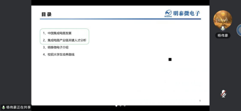 【本网讯】为积极拓宽毕业生就业渠道,加强校企合作深度融合,促进人才供需精准对接,2025年9月2日下午16:00,物理与电子电气工程学院与四川明泰微电子科技股份有限公司联合举办了一场线上专场招聘会。此次招聘会为学院2026届毕业生提供了众多优质岗位,搭建了便捷高效的就业平台,参加此次招聘会的有公司人事经理杨伟豪,学院就业干事赵雪莲以及2026届毕业生。