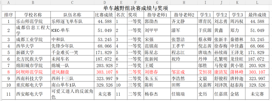 【本网讯】2023年7月21日—23日,全国大学生智能汽车竞赛西部赛在重庆邮电大学顺利举行,阿坝师范学院在西部十省市高校竞赛中再创佳绩。本次我校物理与电子电气工程学院共派出七支参赛队伍,经过激烈的角逐,我校学子共获得西部一等奖2项,二等奖2项,三等奖3项。其中智能视觉组获得西部一等奖第1名,负压电磁组获得西部一等奖第2名,越野单车组获得西部第8名,预计3支队伍将代表西部高校参加在天津工业大学举办的全国大学生智能汽车竞赛总决赛。